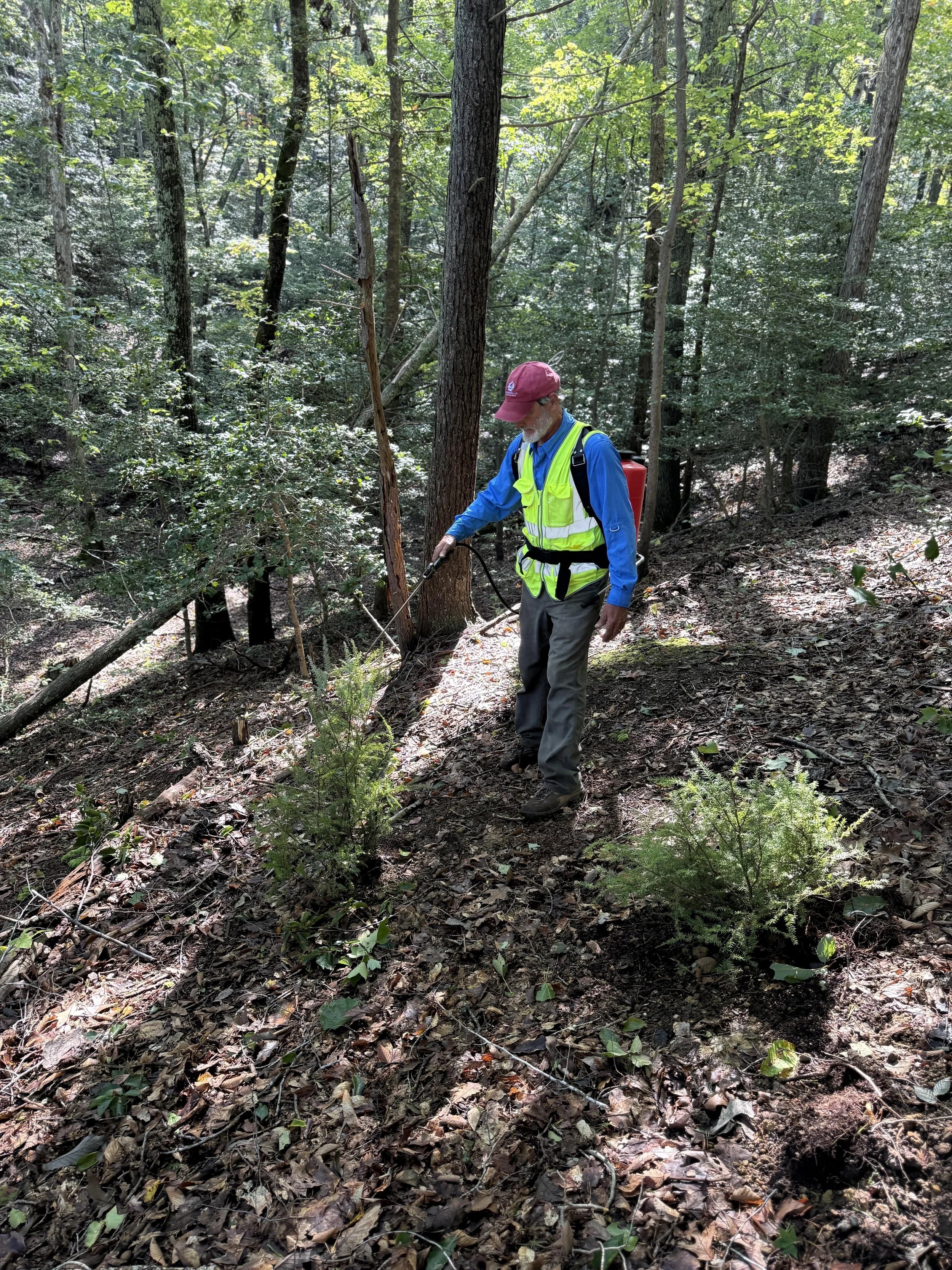 At Cove Point Natural Heritage Trust, we are working to protect our Eastern Hemlocks from existing infestations and mitigate the spread of the Woolly Adelgid to our new growth hemlocks. These efforts include carefully monitoring our stands for early signs of infestation, applying targeted treatments when necessary, and supporting the long-term health of young trees through ongoing maintenance and care.